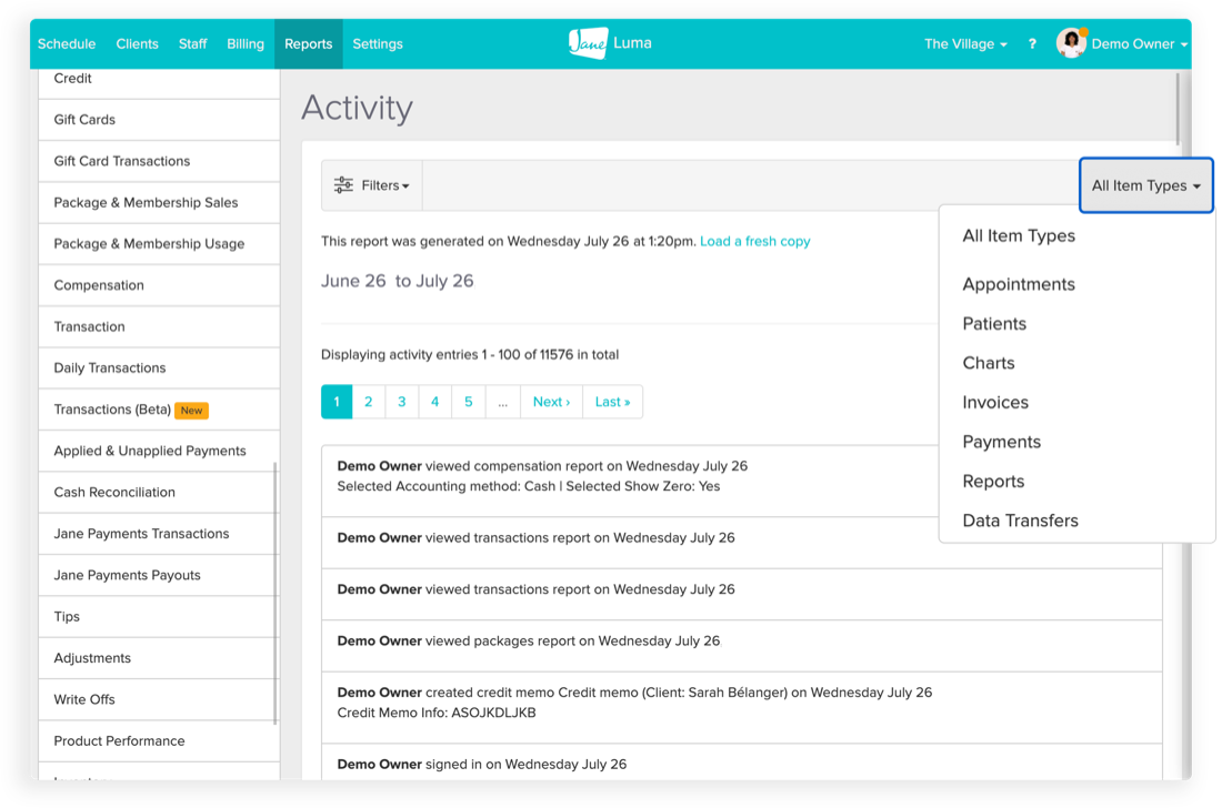 • Filter activity by areas in your Jane account, such as appointments, patients, charts, invoices, and more