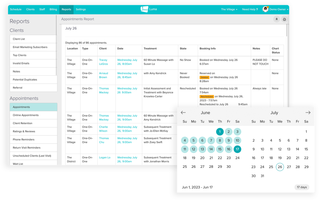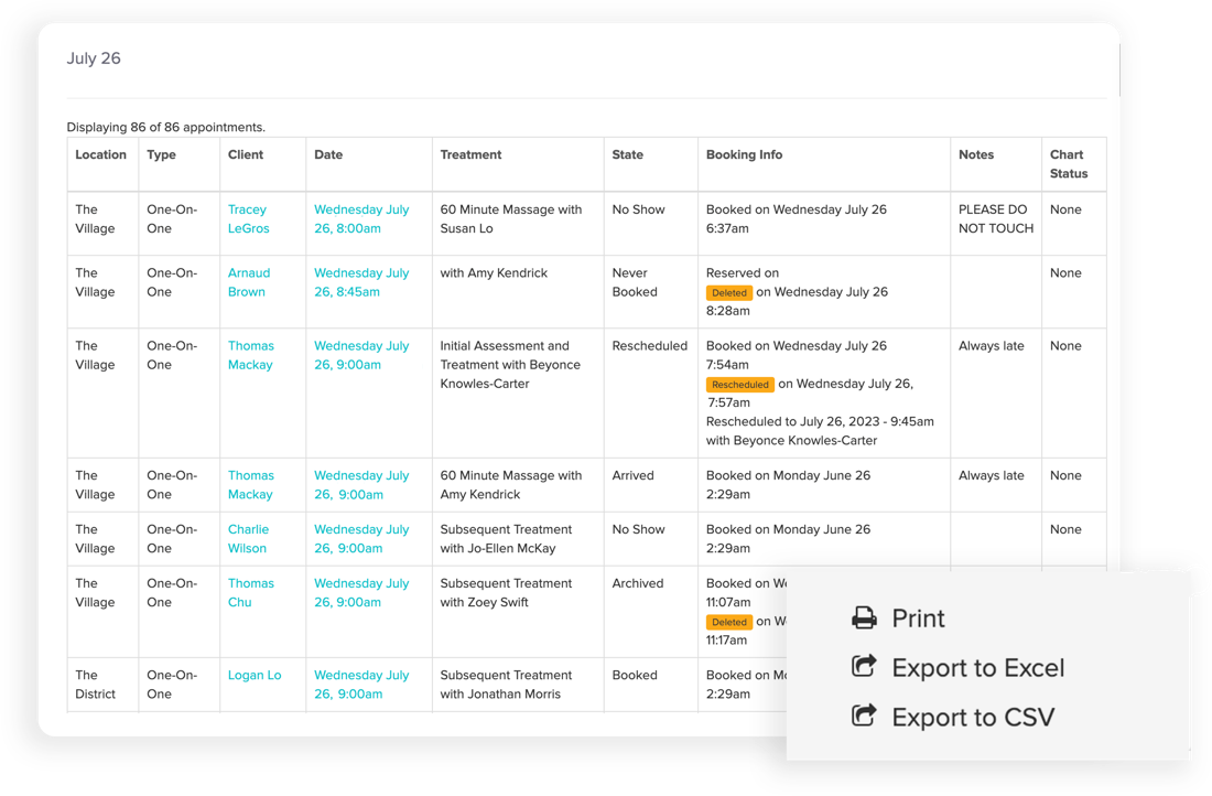 • Get an overview of the booking information, booking state, chart status, and any notes associated with your patients’ appointments with our Appointments Report