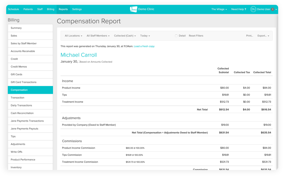 • Record all practitioner income, commissions, and fees with Jane’s extensive Compensation Report — allowing you to quickly see how much each practitioner should be compensated